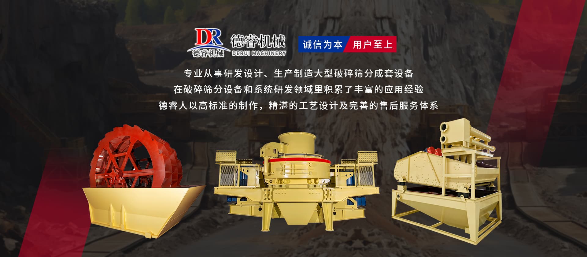 “誠信為本,用戶至上”德睿人以高標準的制作,精湛的工藝設計及完善的售后服務體系在破碎篩分設備和系統研發(fā)領域里積累了豐富的應用經驗。借助在破碎行業的豐富經驗,公司可向客戶提供碎石制砂生產線設計、安裝、調試等交鑰匙工程,同時承接破碎系統的爆破、裝運、破碎等生產運行總承包。